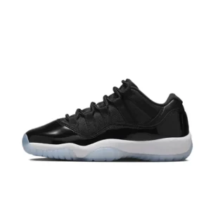 The Air Jordan 11 Low GS Space Jam is a sleek and stylish low-top version of the iconic Space Jam colorway. It features a black patent leather and mesh upper, a white midsole, and an icy blue translucent outsole for a clean and modern look. Designed for comfort and durability, it includes full-length Air cushioning and a carbon fiber plate for added support. Perfect for sneaker lovers in Rwanda, this edition brings a legendary design to a fresh low-top silhouette.