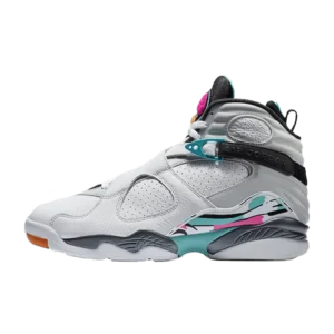 The Air Jordan 8 South Beach White is a vibrant, eye-catching release that blends the classic Jordan 8 silhouette with a fresh, tropical-inspired colorway. The sneaker features a white leather upper accented with bright pink, teal, and black details, reminiscent of Miami’s South Beach vibe. The multi-colored straps and the signature chenille Jumpman logo on the tongue add extra flair, while the comfortable, supportive sole ensures lasting wear. This pair is perfect for sneaker lovers in Rwanda who want to make a bold, fashionable statement.