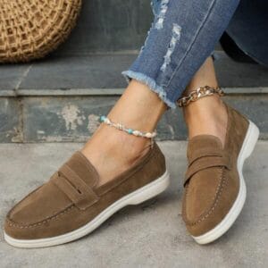 Step into timeless elegance with these women’s brown slip on loafers, featuring a stylish decorative strap and flat sole for all-day comfort. Perfect for work, meetings, or casual wear.